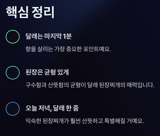가장 흔한 실수는 달래를 초반에 넣는 거예요. 이렇게 되면 찌개는 익어도 달래 향이 거의 느껴지지 않아서 그냥 일반 된장찌개처럼 끝나기 쉬워요. 이미 오래 끓여 향이 약해졌다면, 마지막에 생달래를 조금 더 추가해서 향을 보완하는 방법이 있어요. 달래는 익힘보다 향을 입히는 재료라고 생각하면 훨씬 다루기 쉬워요.