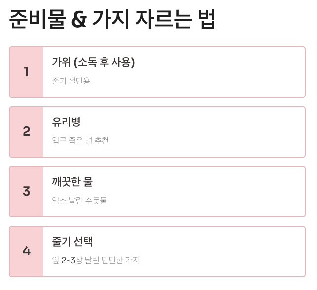 물은 수돗물을 바로 써도 되는 편이지만, 염소 냄새가 강하면 하루 정도 받아서 두었다가(염소를 날려서) 쓰면 더 좋습니다. 그리고 물 높이는 너무 욕심내지 마세요. 줄기가 많이 잠기면 산소 부족으로 썩을 확률이 올라갑니다. 보통 줄기 아래 2~3cm, 또는 마디 1~2개 정도만 잠기게 유지하면 안정적입니다.