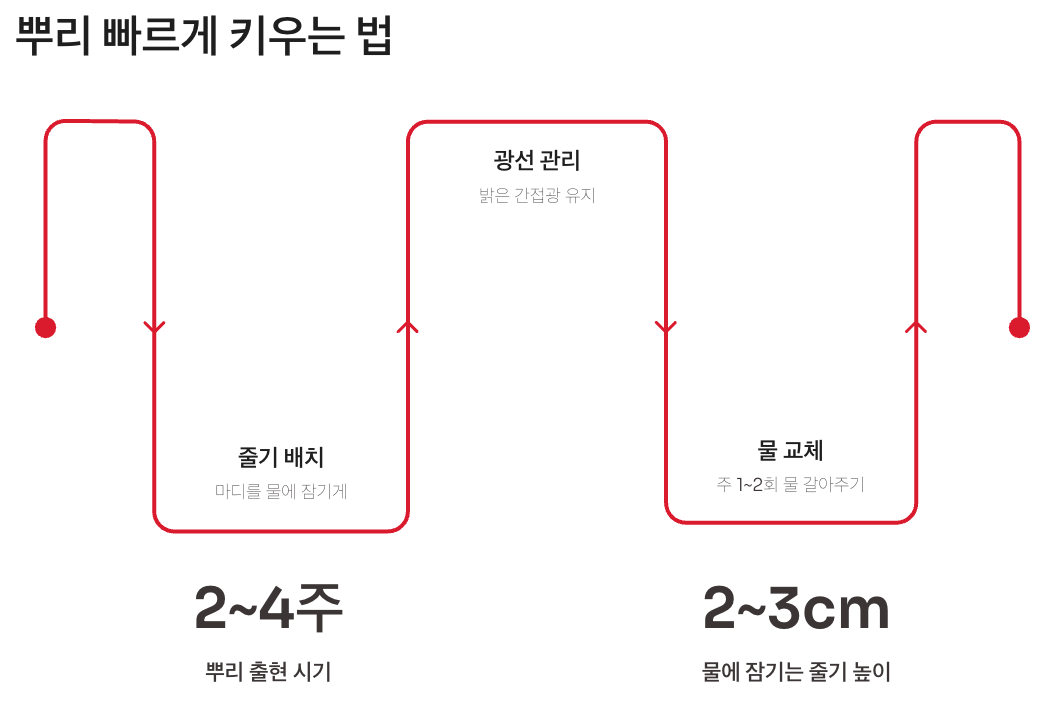 - 물 높이는 줄기 2~3cm 정도만 잠기게 유지