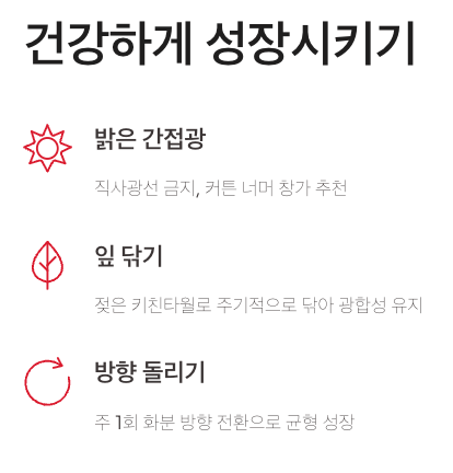 - 직사광선 대신 밝은 간접광 유지