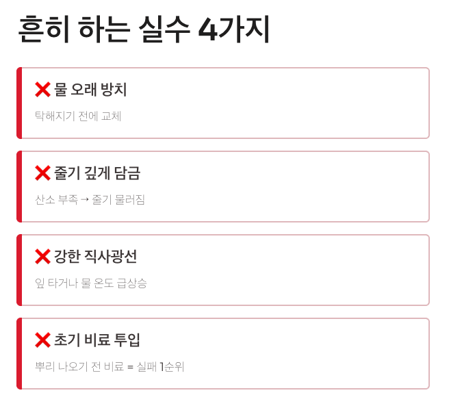 - 줄기까지 깊게 담가서 줄기 물러짐 유발