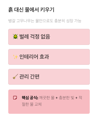 또 의외로 많은 분들이 “햇빛 강할수록 좋다”로 오해하더라구요. 뱅갈 고무나무는 빛을 좋아하지만, 수경재배에서는 물 온도 관리까지 같이 가야 해서 강한 직사광선은 독이 될 수 있습니다. 마지막으로 비료 욕심! 뿌리가 약할 때 비료를 주면 진짜 멘붕 옵니다. 처음엔 물 + 빛 + 청결만으로도 충분해요.