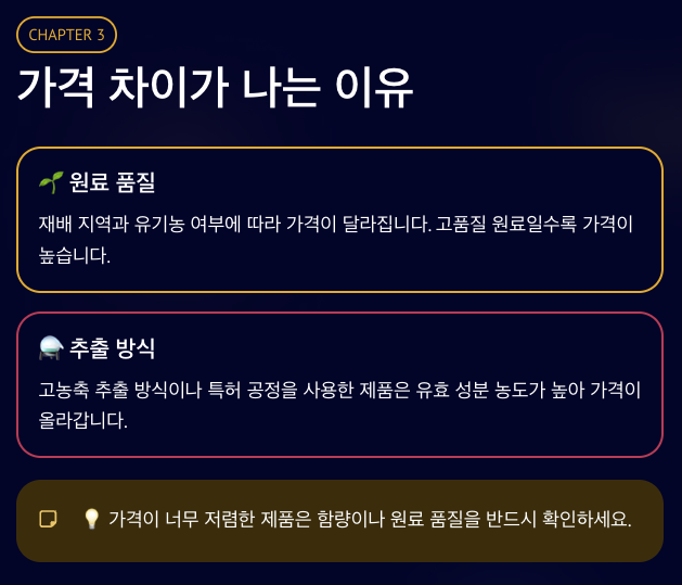 A. 원료 품질, 추출 방식, 함량, 브랜드 등에 따라 가격 차이가 발생합니다.