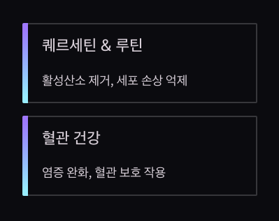 대표적으로 퀘르세틴과 루틴 성분이 포함되어 있으며 혈관 건강과 염증 완화에 도움을 줄 수 있어요.