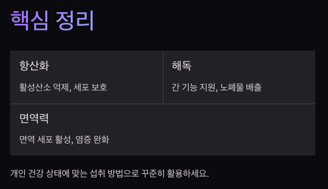 A. 항산화 작용, 해독 작용, 면역력 강화 등이 대표적으로 알려져 있습니다.