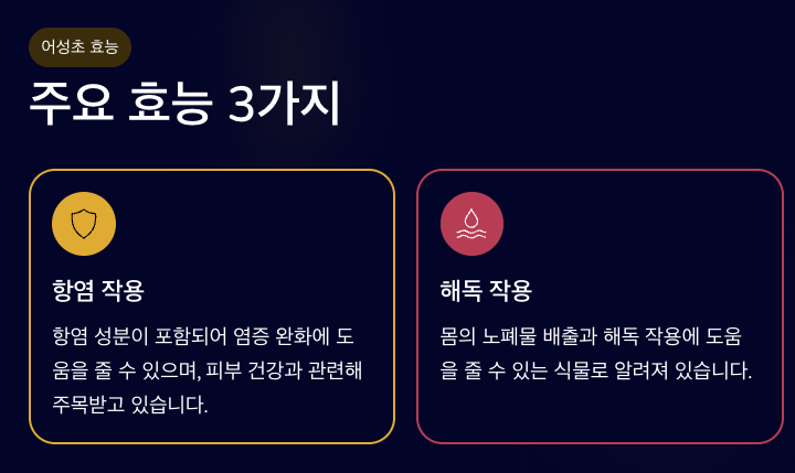 어성초는 전통적으로 해독 작용과 염증 완화에 도움을 줄 수 있다고 알려져 다양한 건강 관리 목적으로 사용되어 왔습니다.