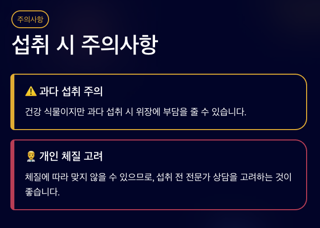 체질에 따라 맞지 않을 수 있으므로 섭취 전 전문가 상담을 고려하는 것이 좋습니다.