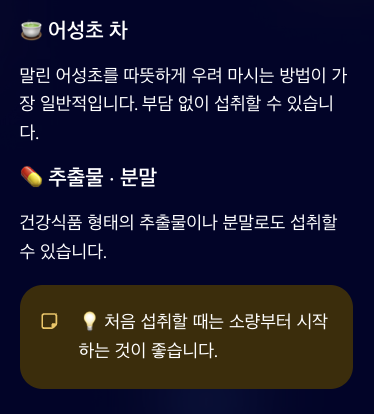 어성초를 말린 후 차로 우려 마시는 방법이 가장 일반적입니다. 따뜻하게 마시면 부담 없이 섭취할 수 있습니다.