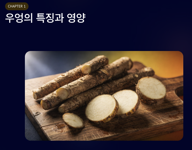 우엉은 식이섬유가 풍부한 뿌리채소로 장 건강에 도움을 줄 수 있는 식품입니다.